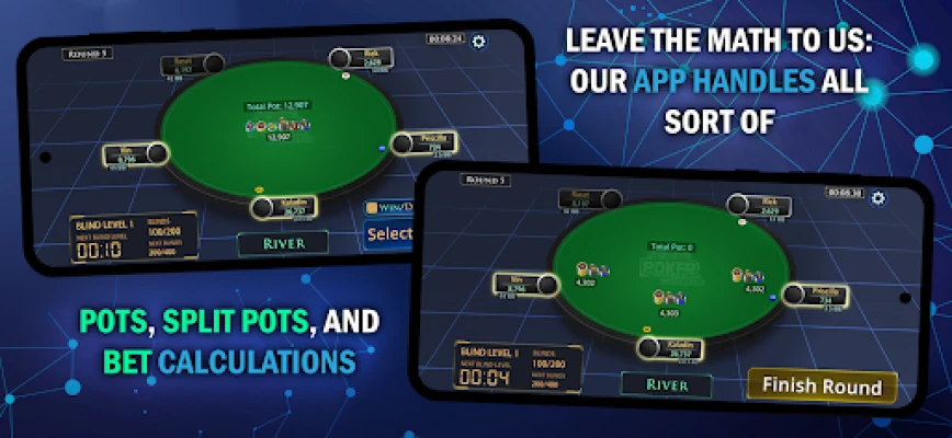 - The app calculates all sorts of bets, pots, split pots, side pots, and blinds for you.
